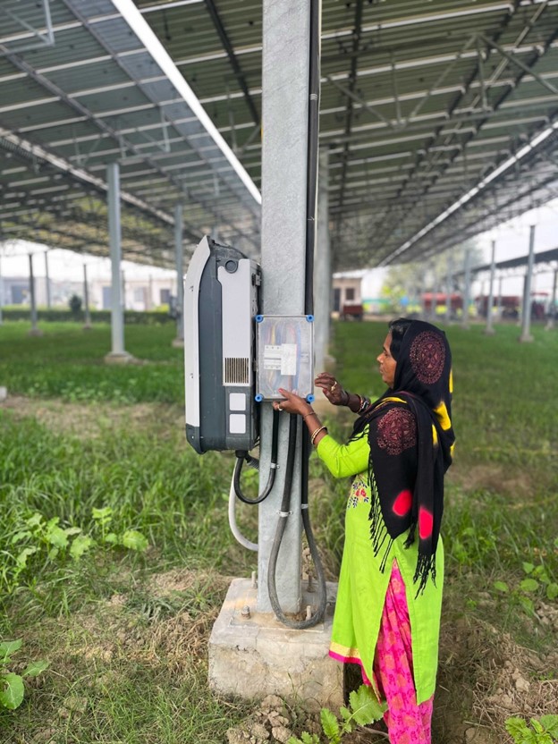 Co-locating solar and agricultural activities has the potential to sustain and improve women’s livelihoods, who make up two-thirds of India’s agricultural workforce. Laxmidevi, who has been with the plant since its inception in 2021, lost her previous job at a local factory during the COVID-19 pandemic. The Issapur plant provided her with the opportunity to earn a stable income within her village.