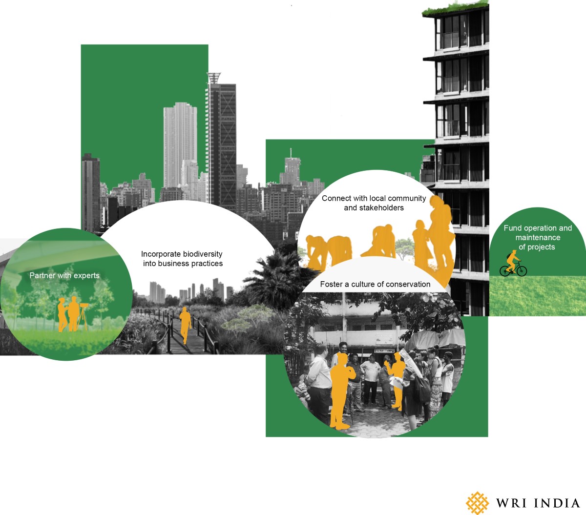 Five ways in which businesses help strengthen urban biodiversity. Illustration by Tahani Khan/WRI India.