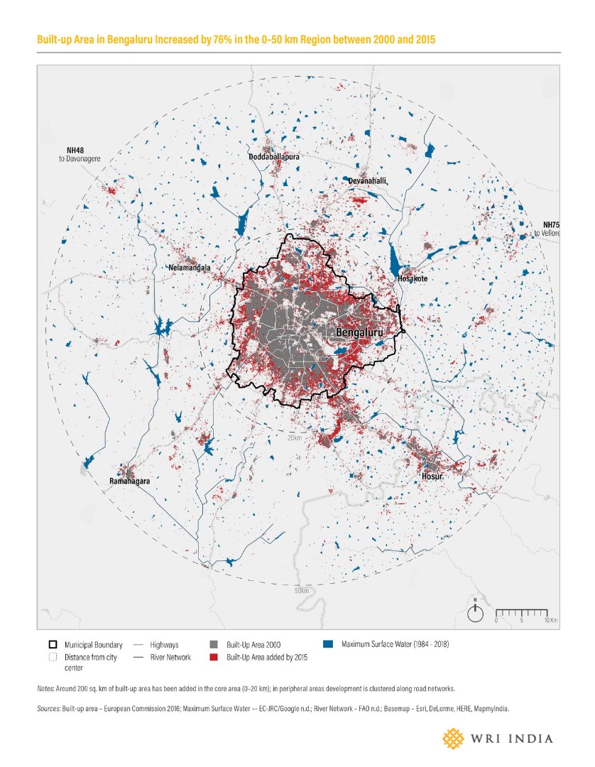 The story of rampant urbanization in the periphery of cities, without adequate infrastructure and services to support it, can be witnessed across urban India. The water-scarce regions of the city often lie on the periphery and witness high population growth. They undergo increased construction, loss of green cover or area under vegetation, loss of blue cover or waterbodies, and decreased groundwater. During monsoons, the same regions grapple with waterlogging and flooding.