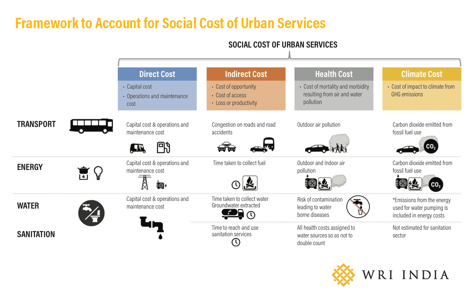 A Social Cost Accounting (SCA) approach, as demonstrated in this paper, should be adopted as a city tool to analyse services in cities so that interactions between different services across multiple sectors are mapped and better understood. Alongside policy and planning changes, new financing tools to fund urban infrastructure and services should be made available. Regulatory environments involving right pricing of services and incentives that encourage innovation and discourage high-carbon, high resource using alternatives should be enabled.