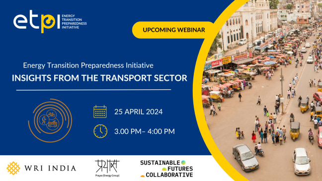 WRI India, along with Prayas (Energy Group) and Sustainable Futures Collaborative organizing a webinar to disseminate key insights derived from the state-level assessment in the transport sector, focusing on state-level actions, notable policies, financial and infrastructural support, social inclusivity measures, governance aspects, and more. These efforts are all geared toward fostering energy transition preparedness.