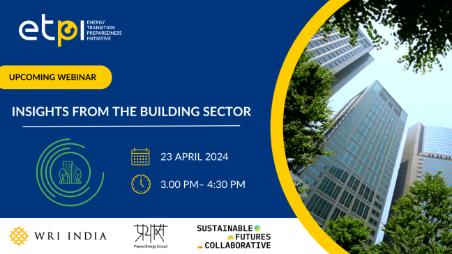 WRI India, Prayas (Energy Group), and Sustainable Futures Collaborative (SFC) invite you for a webinar on Insights from the Building Sector under the Energy Transition Preparedness Initiative. This webinar will delve into the findings from our study on transition preparedness across ten Indian states. The webinar will be hosted April 23, 2024 (Tuesday).