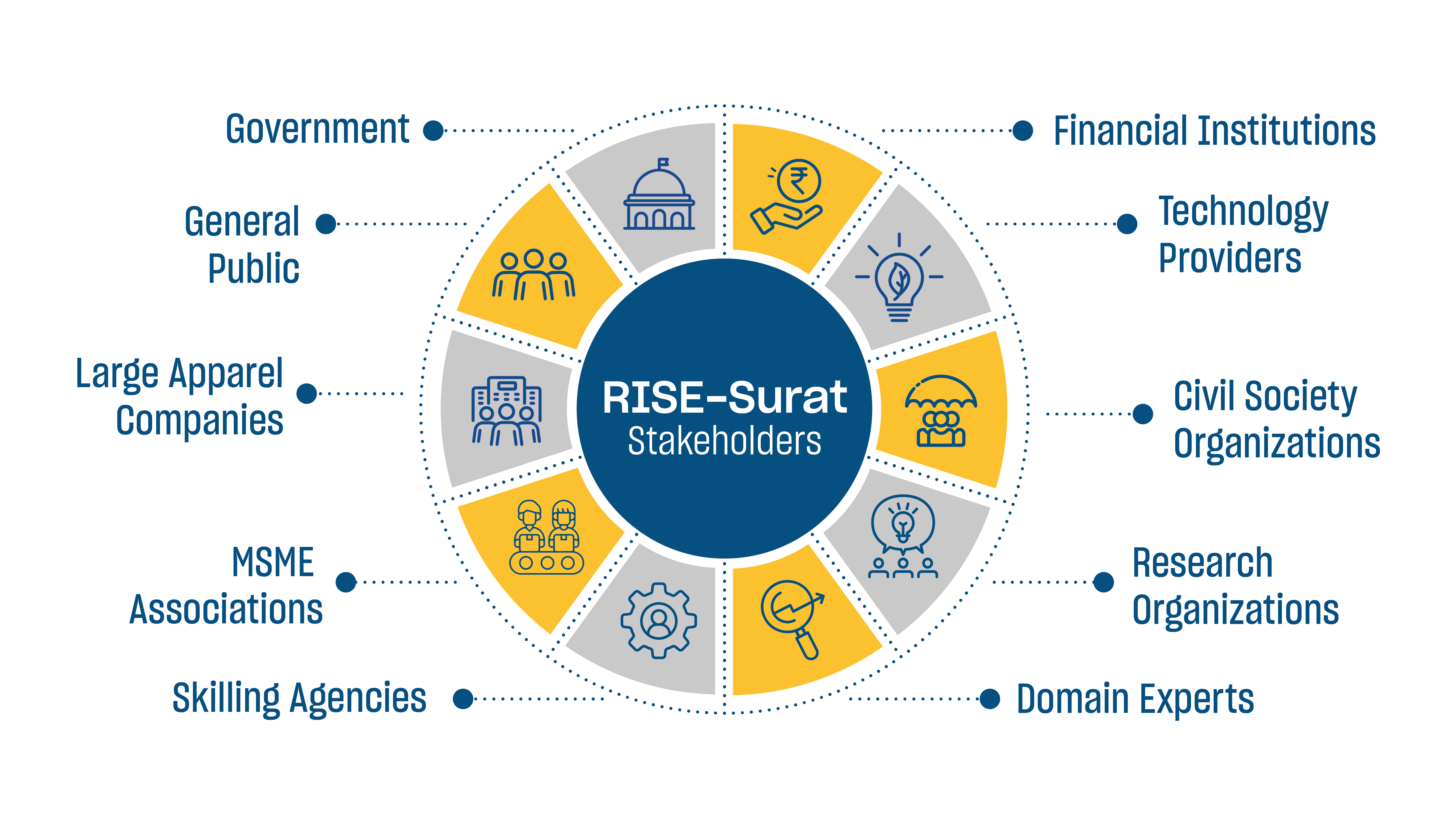 • To help implement interventions in key areas, RISE-Surat has been engaging with key stakeholders at the local, state and national-level such as the Surat Municipal Corporation, Gujarat Pollution Control Board, Gujarat Energy Development Agency, Energy Efficiency Services Limited, NTPC Limited, Textiles Skill Sector Council, Skill Council for Green Jobs, and more.