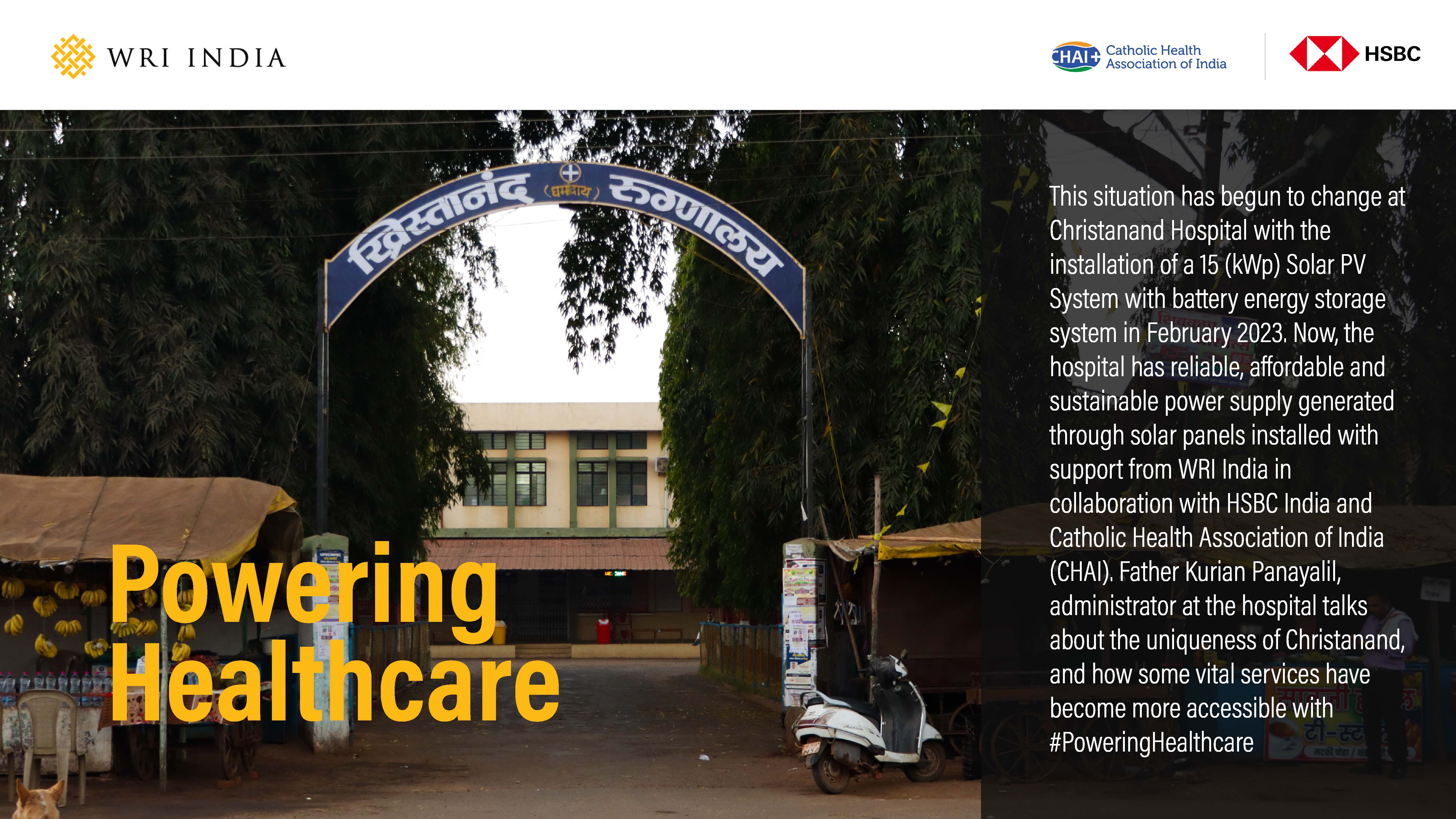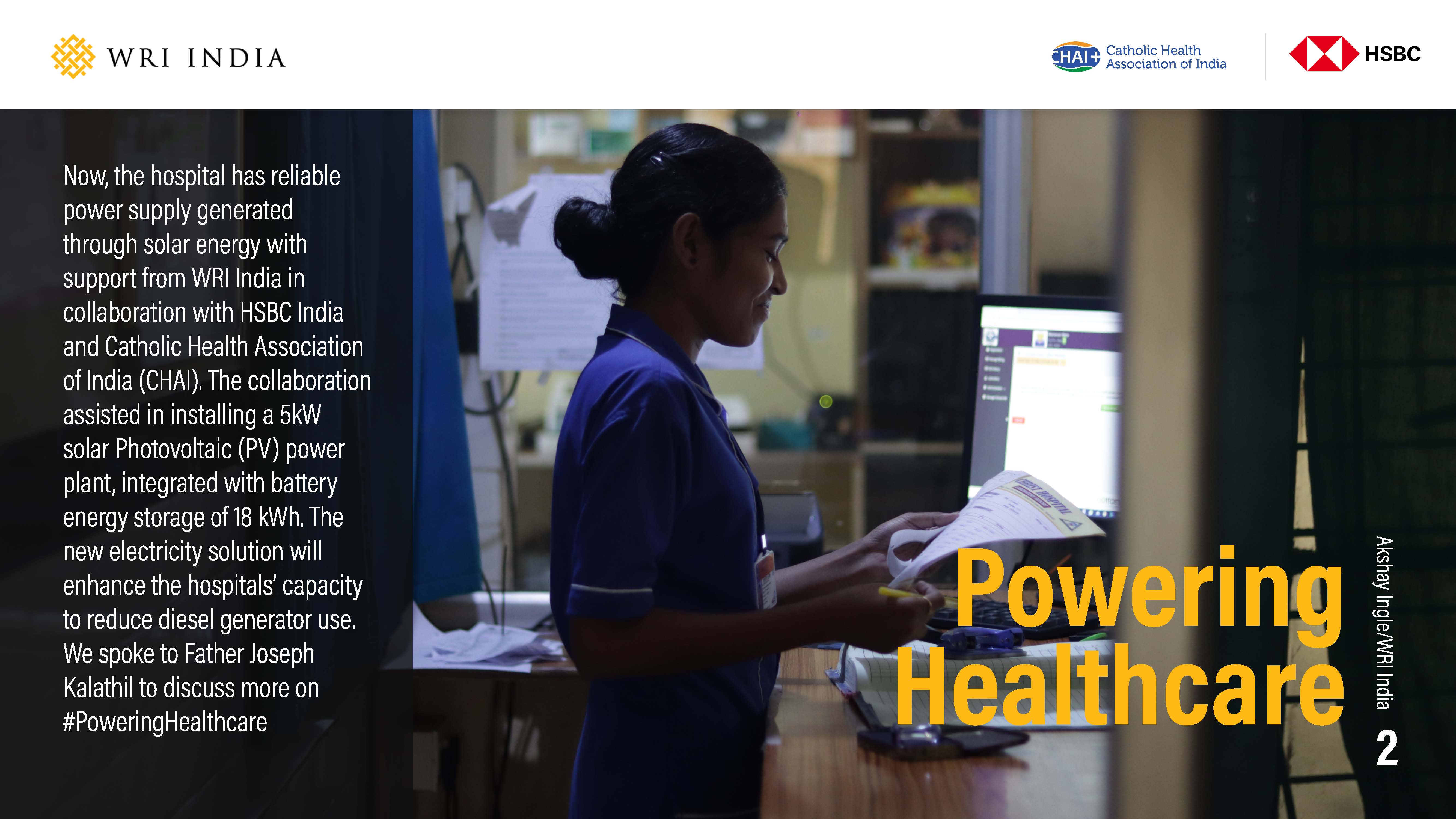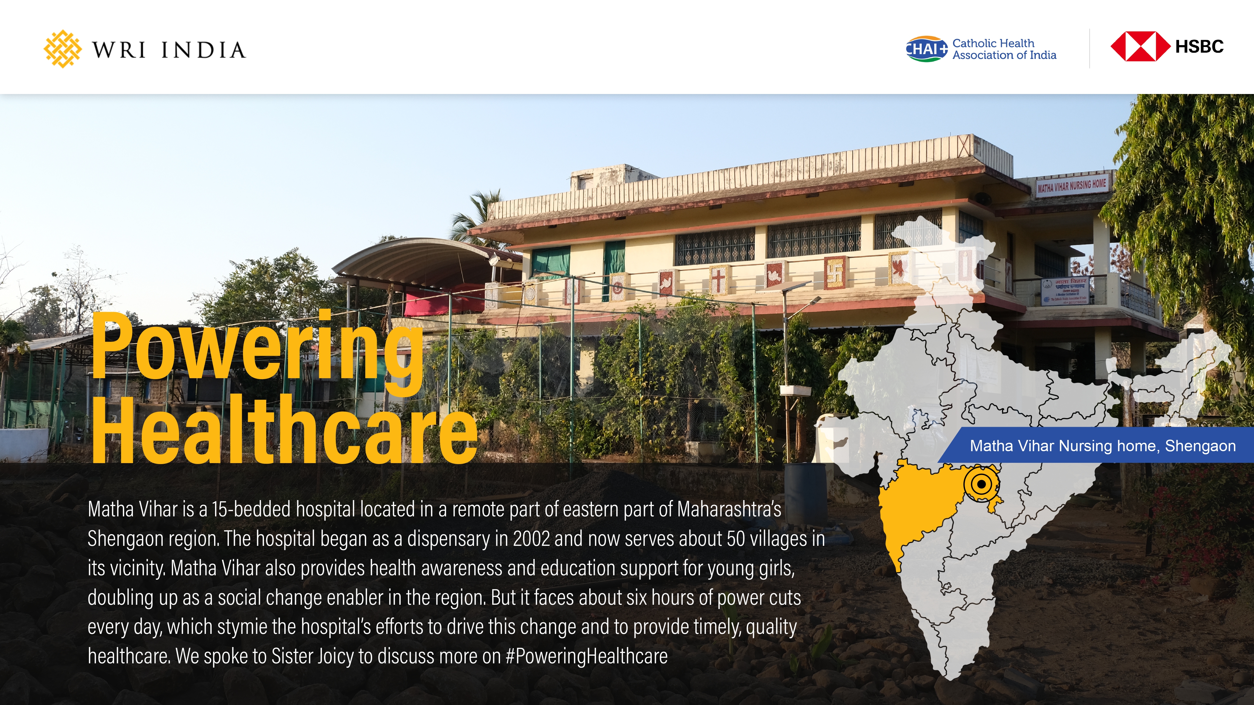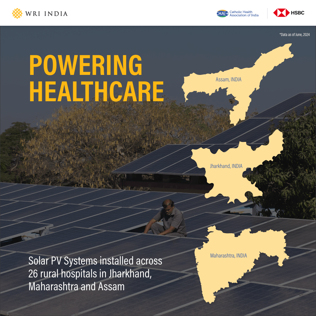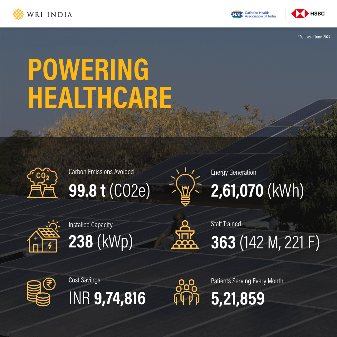 By partnering with HSBC India and Catholic Health Association of India (CHAI), WRI India has supported the installation of 95 kWp of solar PV systems with battery storage across 12 health facilities. These solarized health facilities have a total bed strength of 578 and serve around 120,000 patients every year. Moreover, 138 representatives of health Institutions from diverse backgrounds were provided technical knowledge on the utilization, operation, and maintenance of the decentralized solar energy systems.