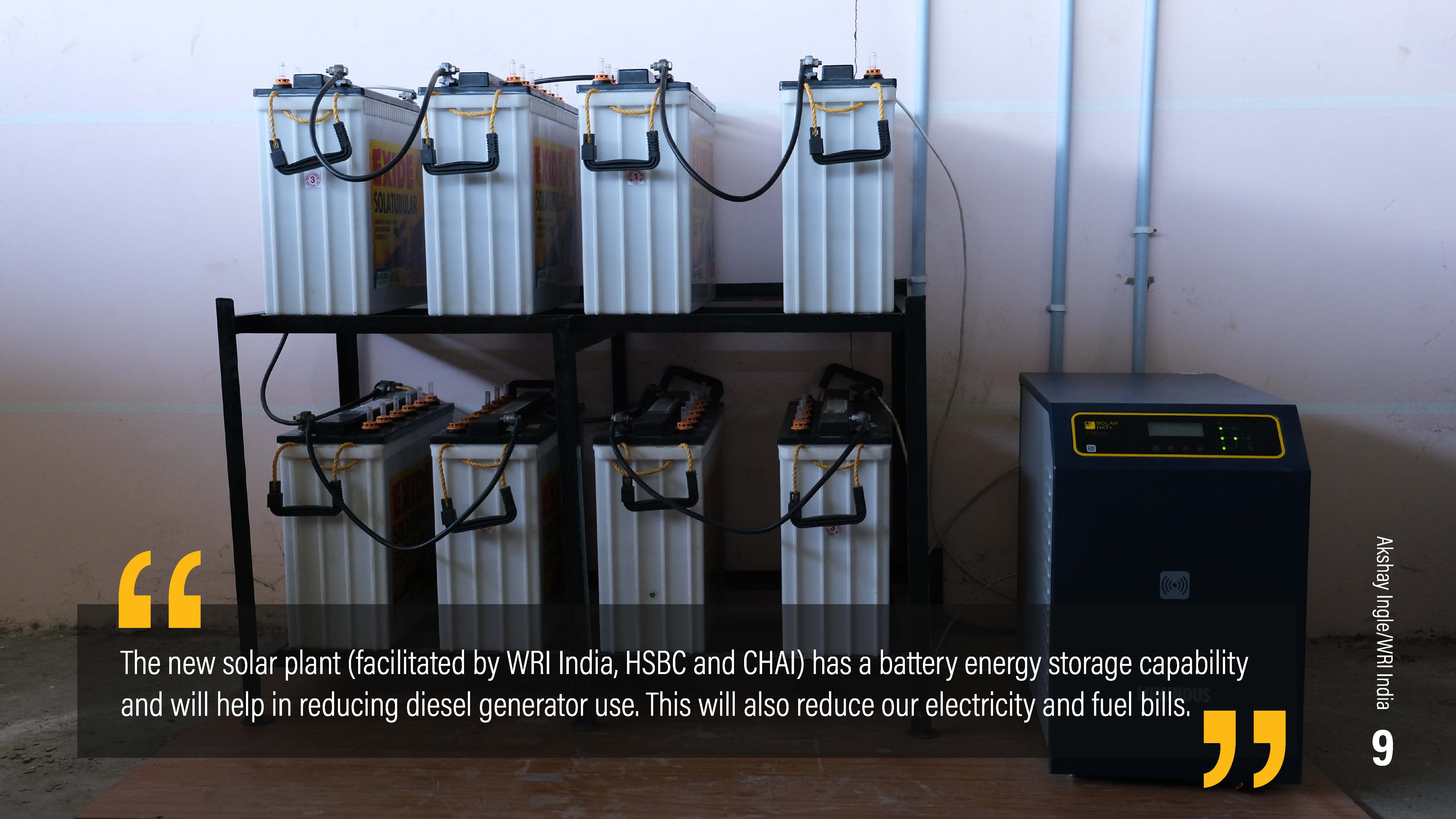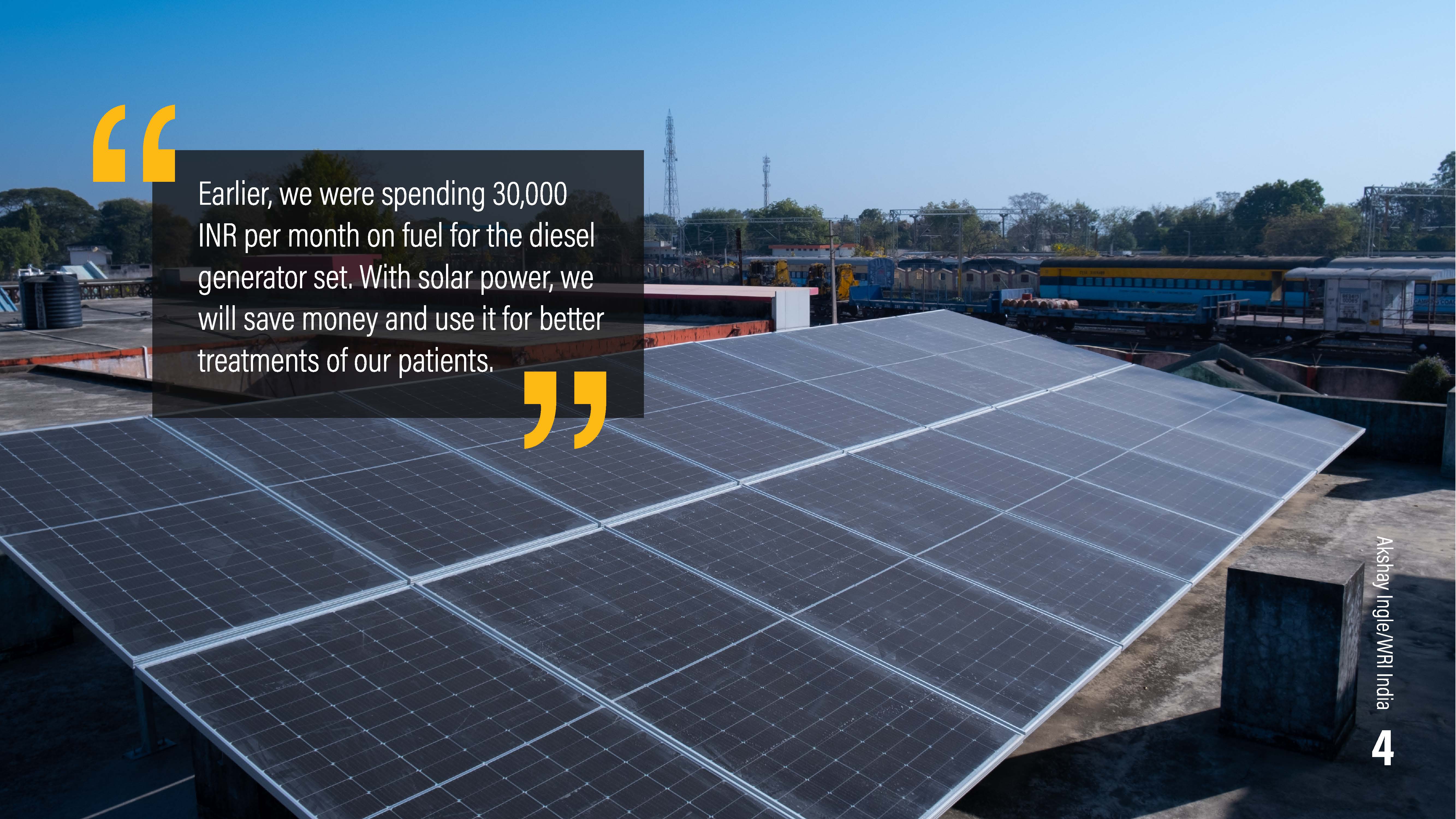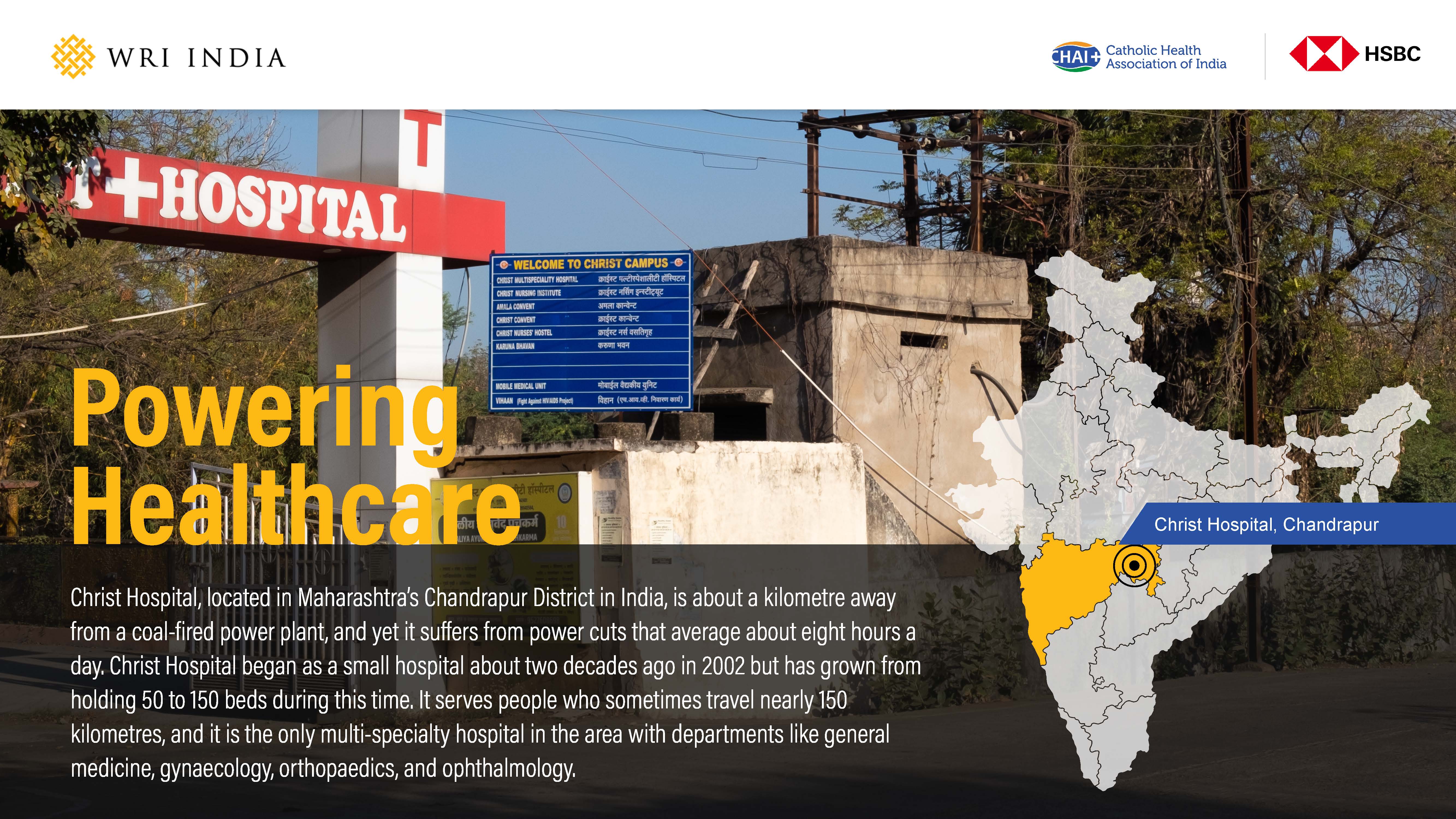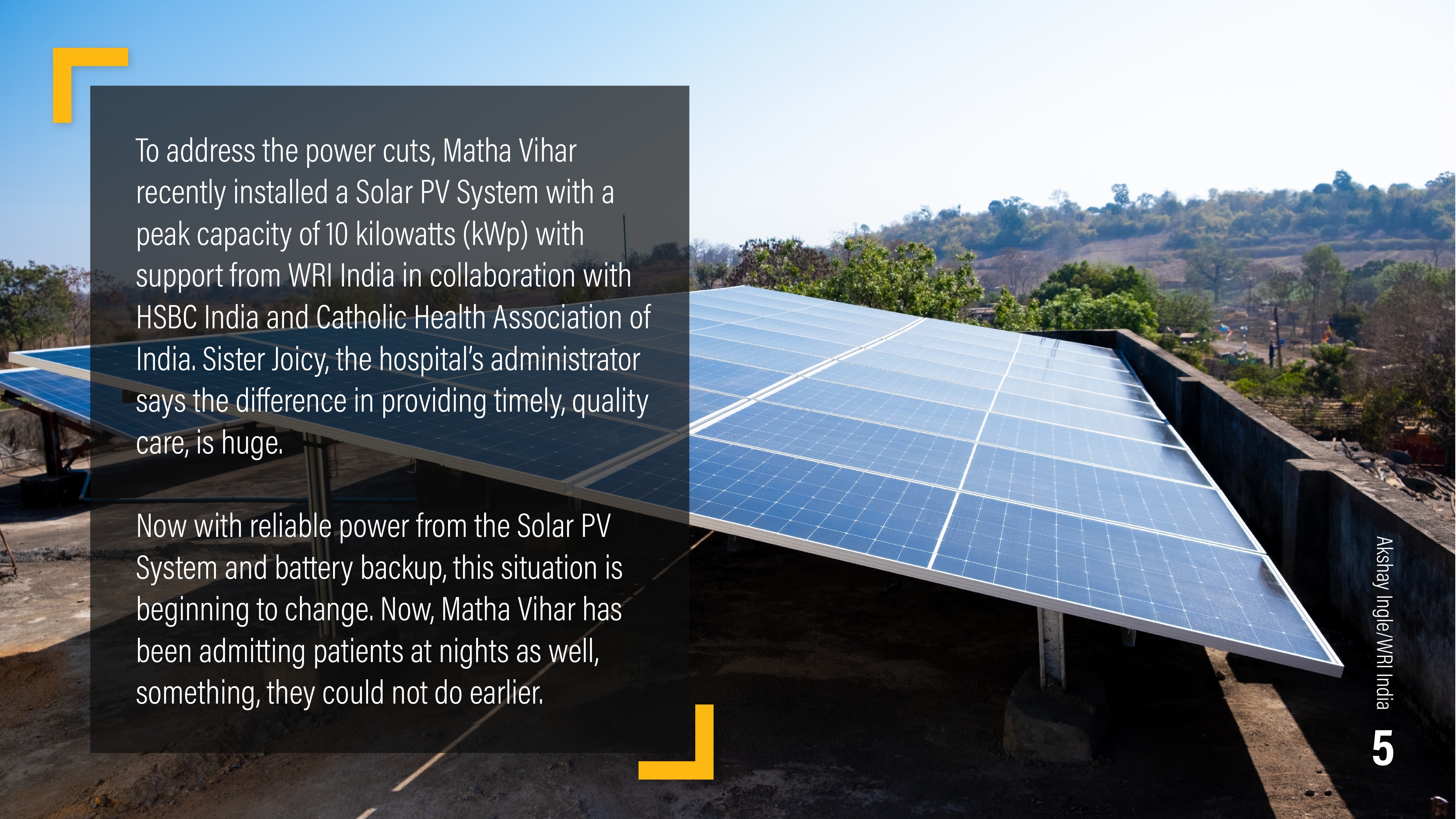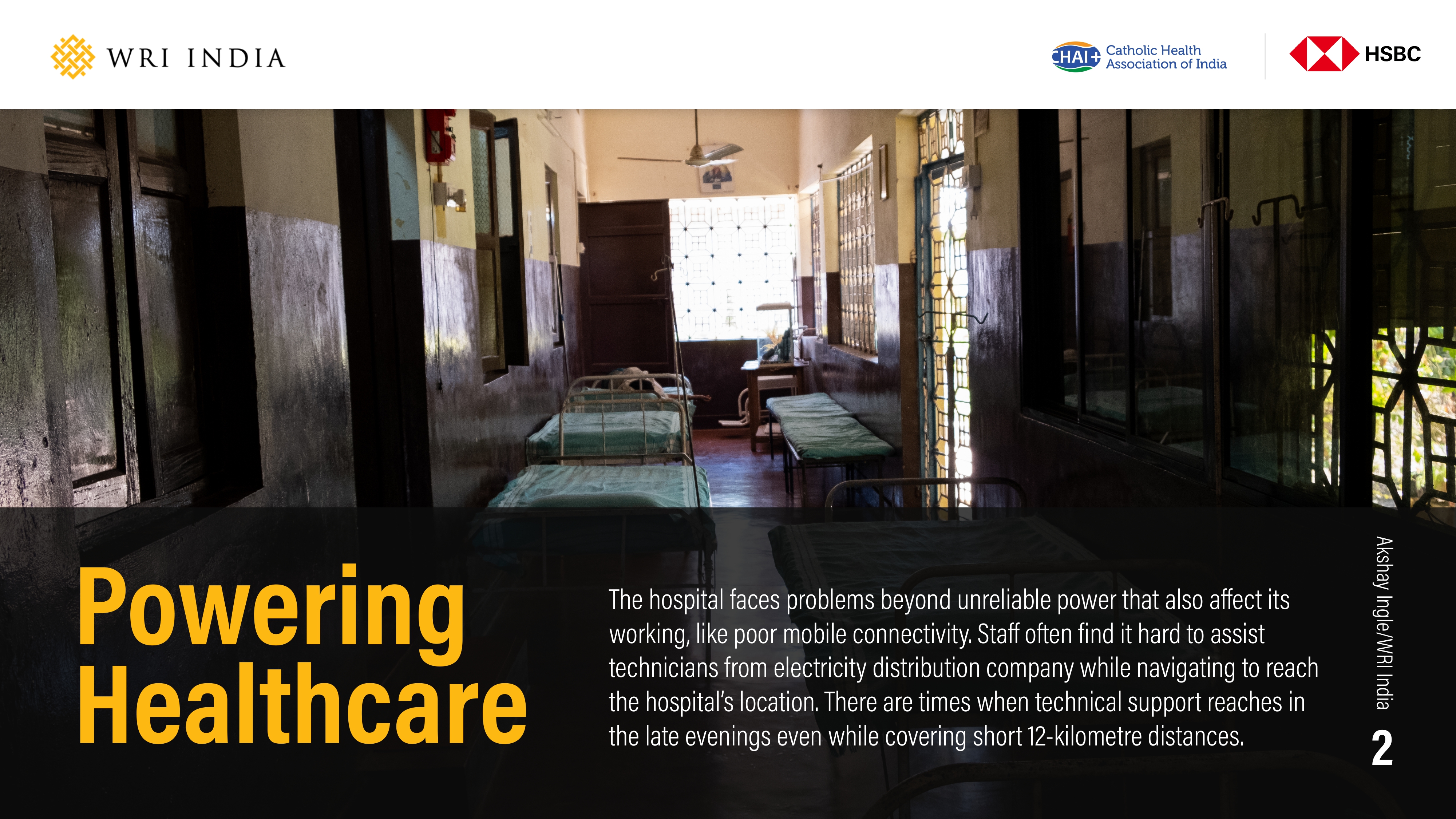By partnering with HSBC India and Catholic Health Association of India (CHAI), WRI India has supported the installation of 95 kWp of solar PV systems with battery storage across 12 health facilities. These solarized health facilities have a total bed strength of 578 and serve around 120,000 patients every year. Moreover, 138 representatives of health Institutions from diverse backgrounds were provided technical knowledge on the utilization, operation, and maintenance of the decentralized solar energy systems.