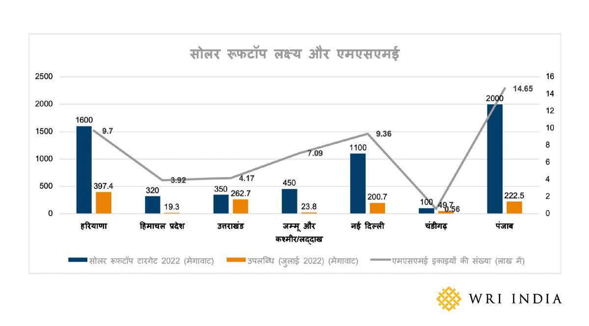 विकासशील भारत खुद को स्वच्छ ऊर्जा को अपनाने की दिशा में प्रेरित करता रहा है और 2030 तक 500 GW का अक्षय ऊर्जा का लक्ष्य निर्धारित करा है| हालांकि यह लक्ष्य बहुत महत्वाकांक्षी है, लेकिन इस तथ्य को बताते हुए कि 2002 में नवीकरणीय ऊर्जा का प्रतिशत सिर्फ 2% था जो 2010 में बढ़कर 10.90% हो गया और दिसंबर 2021 में 38.48% हो गया, इस गति को जारी रखने पर लक्ष्य आसानी से प्राप्त किया जा सकता है| इसमें बडा योगदान दक्षिणी राज्यों का रहा है और उत्तरी राज्यो ने भी एक महत्वपूर्ण भूमिका निभाई है लेकिन अपेक्षाकृत थोडे पीछे रहे हैं। नीचे दिया गया चार्ट सौर रूफटॉप लक्ष्यों का 2022 राज्यवार तुलनात्मक विश्लेषण और अगस्त 2021 तक की गई उपलब्धि प्रदर्शित कर रहा है। इसके साथ ही प्रत्येक राज्य में मौजूद एमएसएमई को भी प्रस्तुत किया गया है।