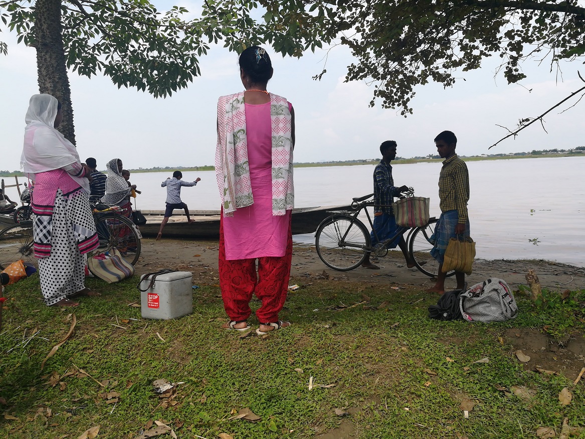 It is the monthly immunization day, and Salma Khatun is waiting for the boat to come take her across the Brahmaputra to Ramhari Char. She holds in one hand an ice box, filled with vaccines she will be administering later that day, and on the other, an umbrella, to protect herself from the fierce summer sun. Salma is a nurse at the only health center in Ramhari Char, an unelectrified island village, one of the many scattered throughout the vast Brahmaptura. In the absence of electricity and storage at the village, health workers like Salma travel to the mainland on the first Wednesday of every month to collect vaccines for immunizing children back at her health center.