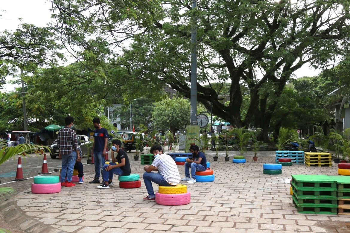 Visualization by Shabna Seemamu/WRI India, Photo by Rajeev Malagi/WRI India - Reclaimed pocket parks, which are public spaces at the very small scale, became pause points for people and improved the area’s vibrancy.